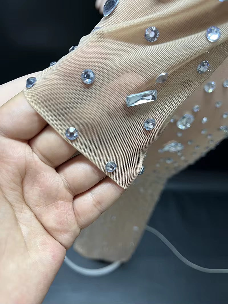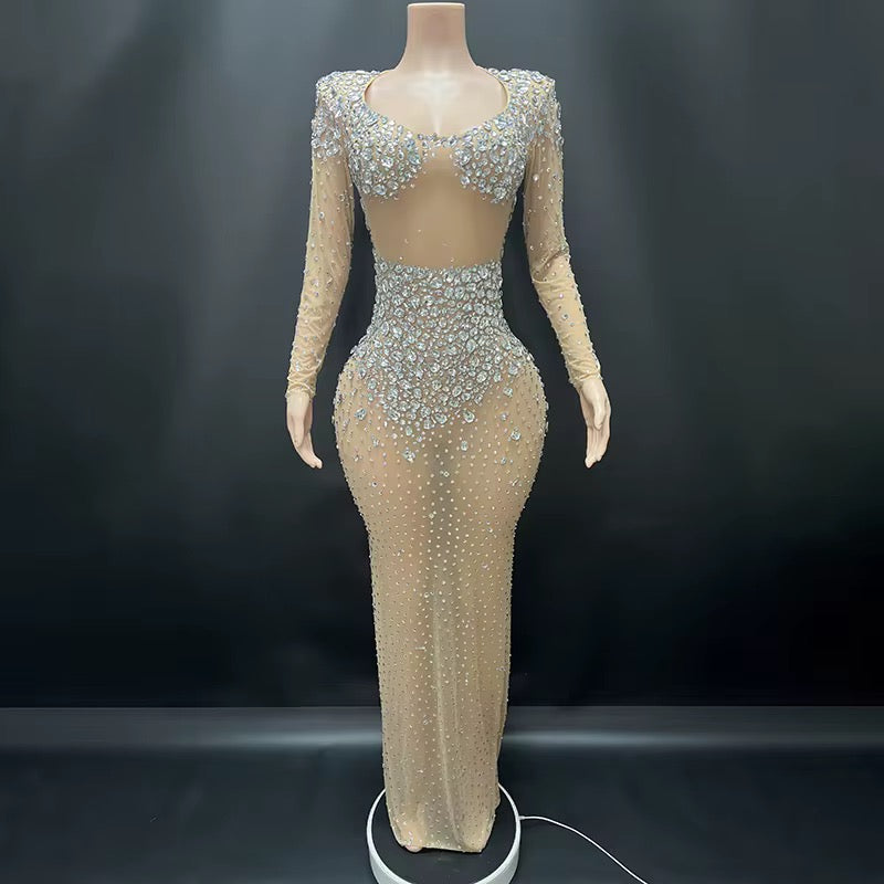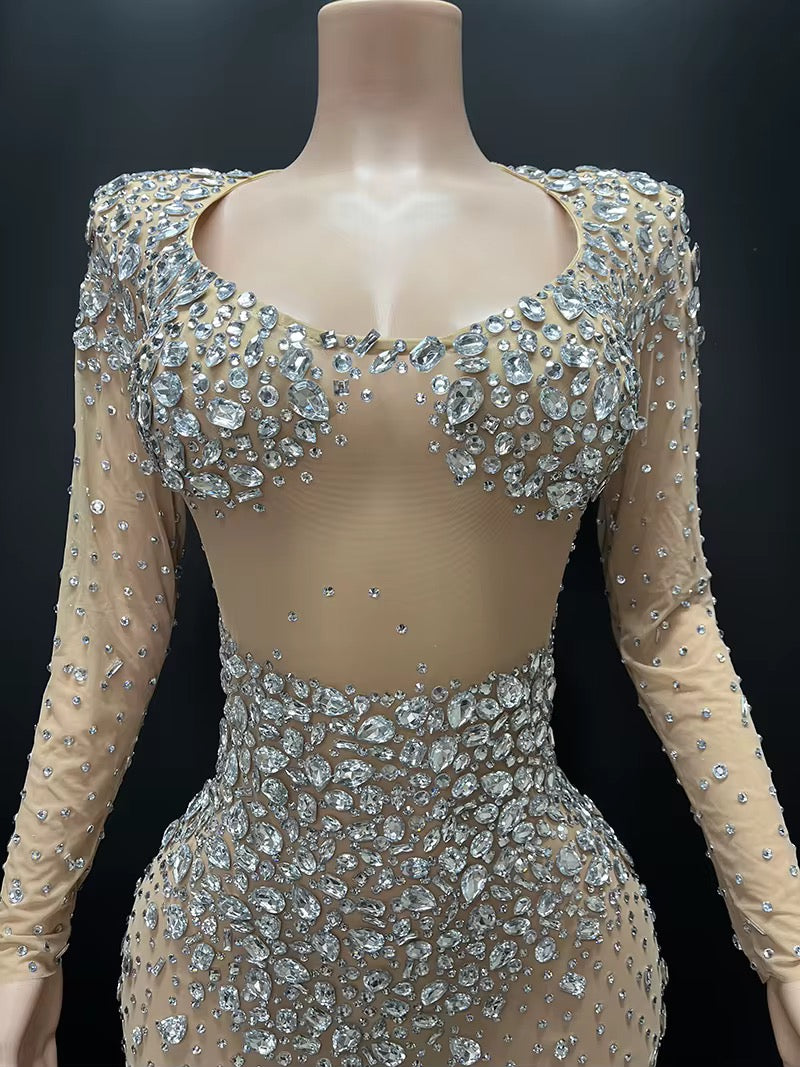 Slip into pure glamour with this stunning mesh crystal dress that catches every light in the room. Adorned with oversized sparkling crystals, this see-through beauty radiates elegance and sophistication. Perfect for anyone who loves to shine, it features a flattering one-size-fits-most cut designed for sizes 2-6. Whether you're heading to a special event or a night out, this dress delivers that show-stopping, head-turning moment you're after. Prepare to dazzle!